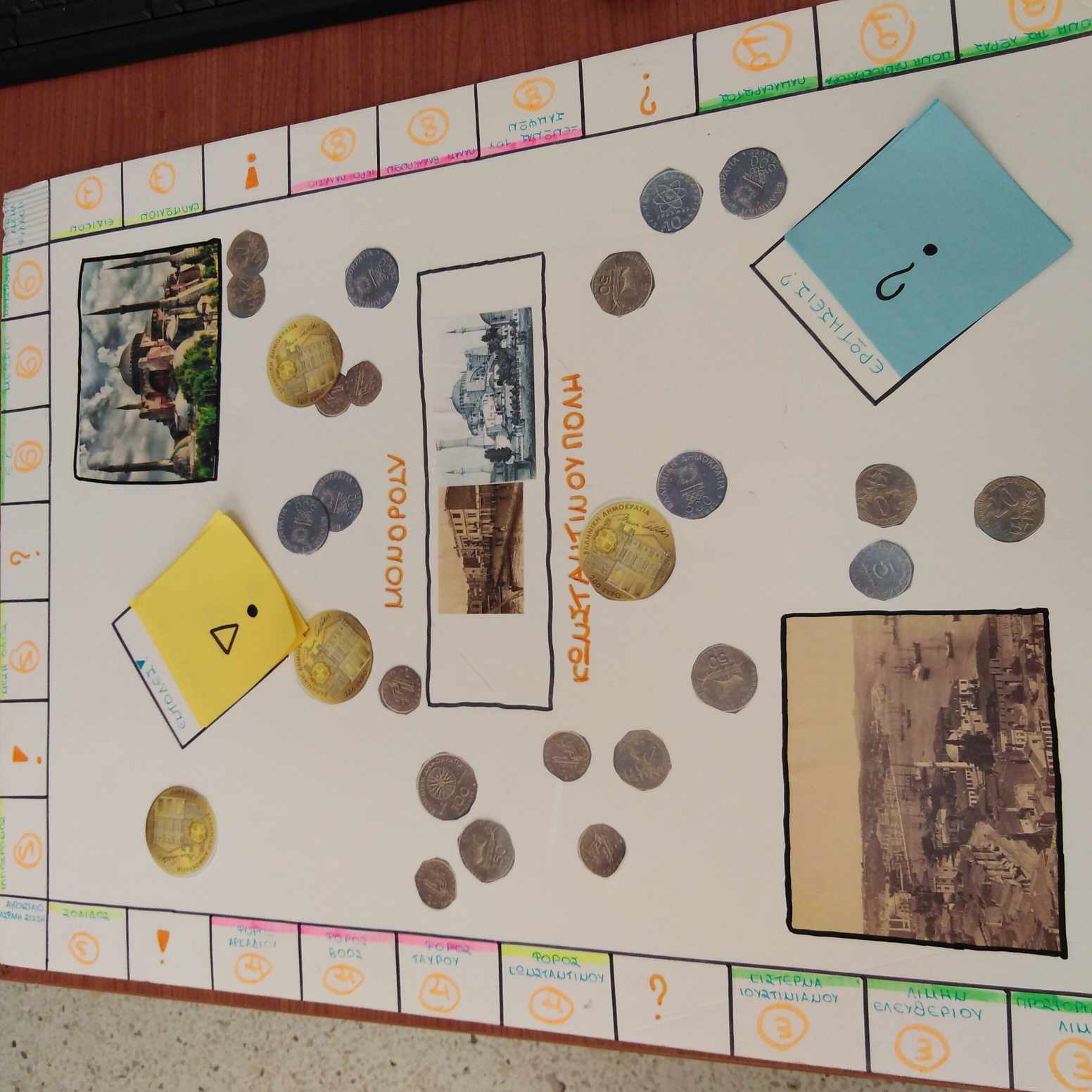Οι μαθητές του Ε1 παρουσιάζουν στα πλαίσια της θεματικής "Κωνσταντινούπολη - Μία Πόλη, μία Ιστορία", το επιτραπέζιο παιχνίδι "Βυζαντινή Μονόπολη". Μελέτησαν έντυπο και ψηφιακό υλικό που έλαβαν κατά τη διάρκεια του μαθήματος της Ιστορίας σχετικά με τη μορφή και τη διάρθρωση της βυζαντινής πρωτεύουσας (τείχη, δρόμοι, λιμάνια, πλατείες, παλάτια,...